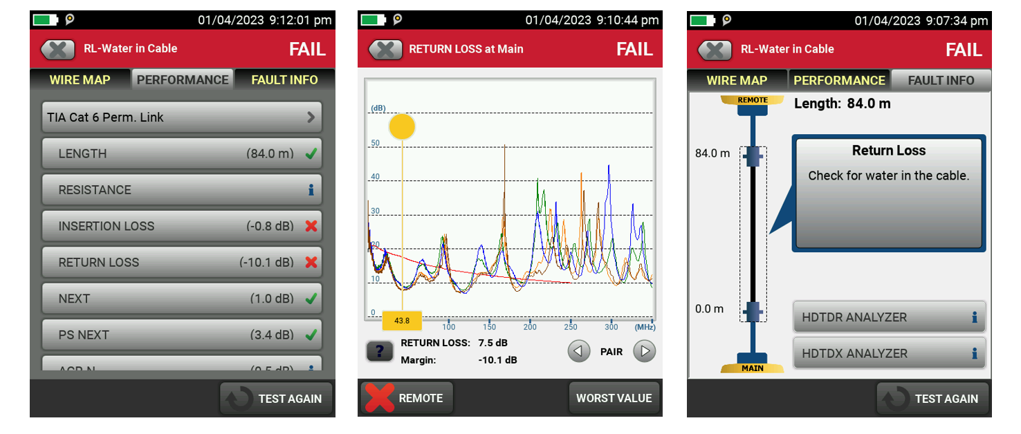 Examples of results from copper cable testing displayed on a DSX CableAnalyzer showing a return loss failure (left), a frequency plot of the return loss (center), and the “Fault Info” screen diagnosing the cause of the return loss failure.