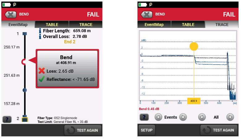 An OTDR plots reflected and backscattered light in a trace that graphically displays the characterization of a fiber link. Experienced OTDR users can typically recognize reflective events for launch cords, connectors, mechanical splices, fusion splices, mis-matched fibers, and the end of the link. However, not everyone is a trace analysis expert. The OptiFiber Pro features advanced logic that automatically interprets the trace and provides an ”EventMap” that indicates the location and reflectance of connectors, splices, and anomalies. (Learn more about fiber troubleshooting, including OTDR’s, in our Fiber Troubleshooting white paper.) Examples of an EventMap and a trace of OTDR results on an OptiFiber tool