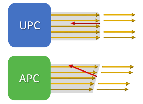 End face shapes of UPC and APC connectors When two UPC connectors mate, reflectance is directed straight back through the fiber core toward the source. However, the angled end face of an APC connector causes much of the reflected light to angle into and be absorbed by the cladding that surrounds the fiber core. While a good UPC single-mode connector will have a value of -50 dB or lower, an APC single-mode connector is typically -60 dB or lower. APC connectivity is therefore often deployed in fiber applications that are more susceptible to reflectance. (Learn more about APC fiber connectivity.)