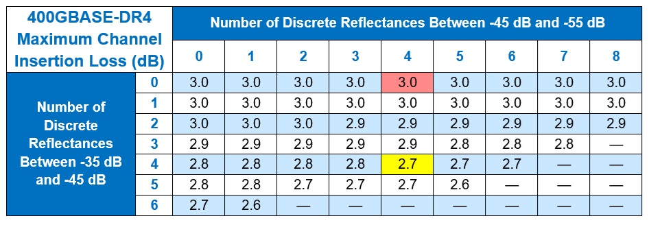 In a 400GBASE-DR4 application with four connectors that have a reflectance value of -50 dB and no connections between -35 and -45 dB, the insertion loss is 3.0dB (highlighted in red in the table).