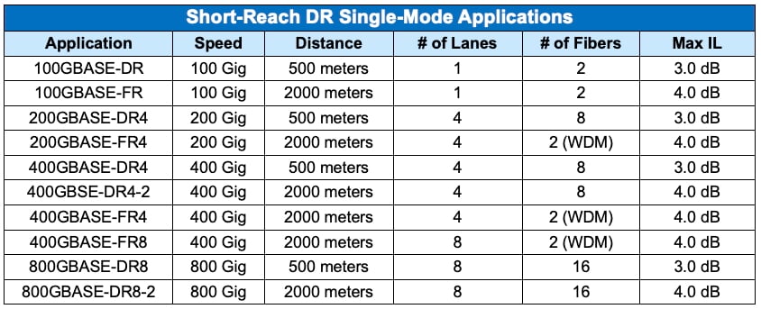 Short-reach single-mode applications are increasingly popular for data center links that require more than the 100-meter distance supported by multimode fiber but do not necessitate the distances of long-reach single-mode applications that use expensive, high-power laser transceivers. Instead, short-reach single-mode applications use lower-cost, low-power transceivers to support distances of 500 meters or 2000 meters. These cost-effective applications come with reduced insertion loss allowances as shown in the table below.