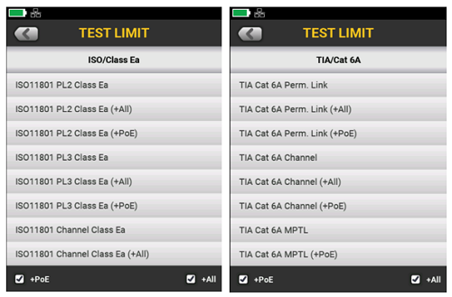 The most recent release of DSX code, 6.1, simplifies the presentation of limits and features both a “+PoE” and “+All” selection at the bottom of many of the TIA and ISO limits. If those are not checked, only the field test limits are shown. Select them, and the list gets longer with “(+PoE)” “(+All)” versions of measurements added to the lists.