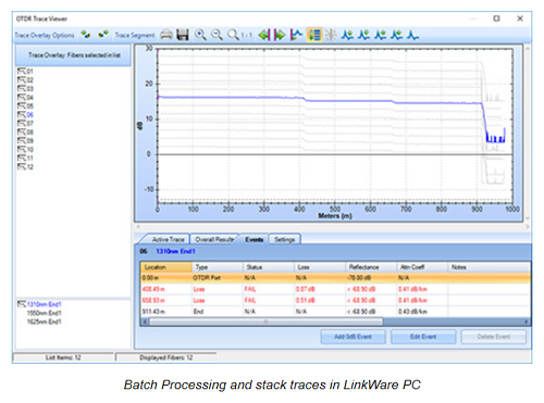 - Stackable results and batch processing of traces. When testing many identical fibers at a time, batch processing allows users to look at multiple traces and stack them to spot differences and/or batch edit events quickly.
