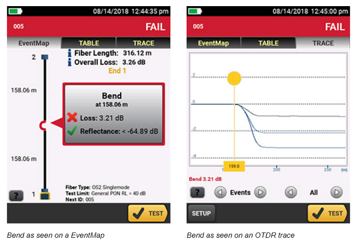 A bend in a fiber cable, if pulled around a sharp corner for instance, allows light to escape from the fiber’s core. The resulting macrobend may be a risk for mechanical or optical failure. OptiFiber Pro automatically identifies bends and their location by comparing the loss of an event at multiple wavelengths.