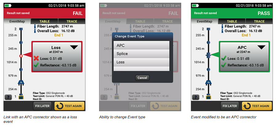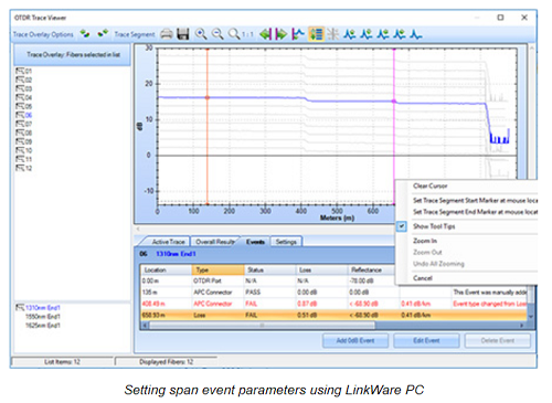 When testing or certifying fiber runs, you want the test results to reflect the links as-built. Sometimes an OTDR can misidentify or not find all the actual events within a link. The Edit Event function provides users with the ability to edit, add or remove events including: