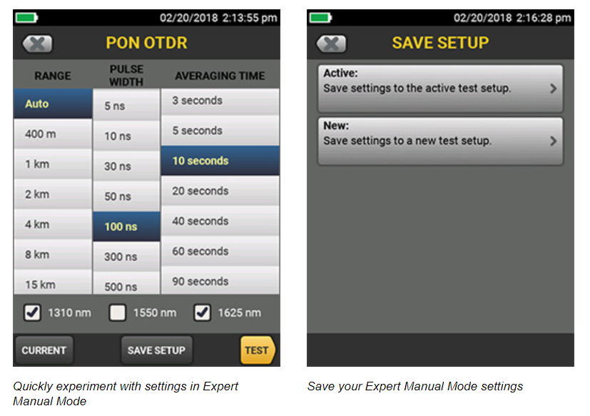 - Auto OTDR modes analyze fiber runs to set key parameters: Range, Pulse Width, and Averaging Time, enabling any user to test like an expert. Expert Manual Mode allows users to easily modify these parameters to zero in on important details.
