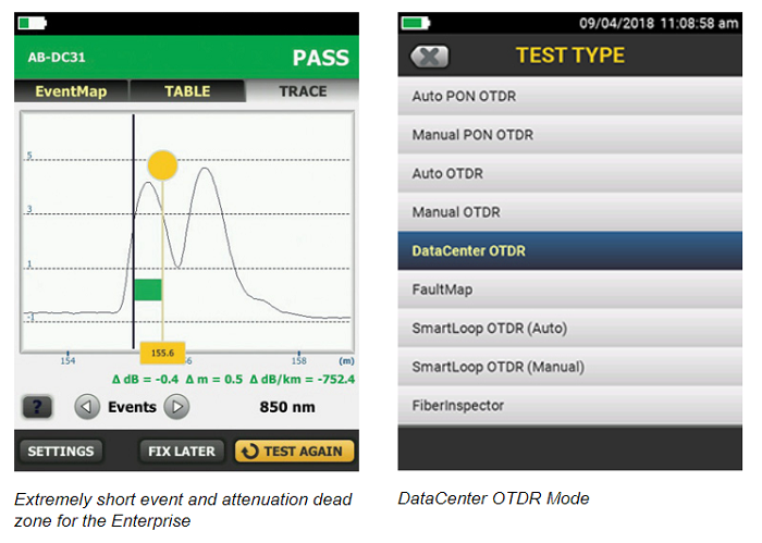 - Datacenter OTDR™ mode automatically sets the configuration to quickly test datacenter fiber