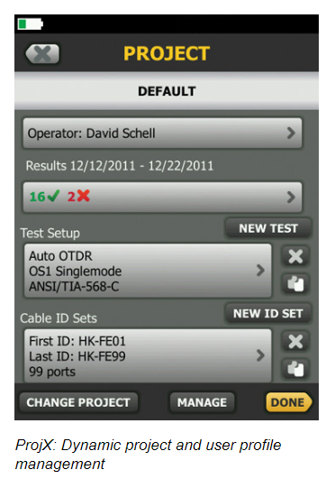 Dynamic project and user profile management with ProjX management system OptiFiber Pro enhances job efficiency by allowing the project manager to create and manage operator and job profiles per project. Defined jobs or sets of cable IDs can be assigned to specific operators. The progress and status of each project can also be easily monitored.