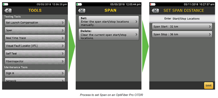 When testing a fiber run (particularly in outside plant applications) you may only be interested in a small section of the cabling. For example, if you are repairing a short section of a longer trunk, span allows you to define the start and end of your short section so that the OTDR analyzes only the section that you repaired.