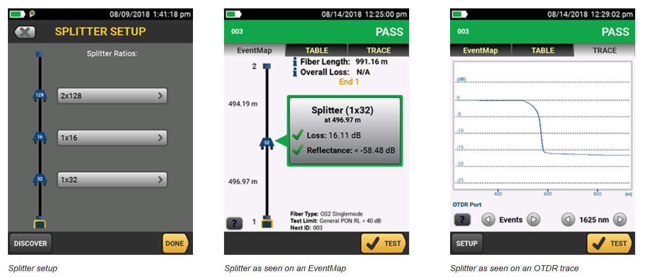 OptiFiber Pro HDR is optimized for FTTx/PON testing through splitters. 1x16 and 1x32 are most commonly found today but OptiFiber Pro HDR is future proofed for testing even nx128 splitters. With its Discover function, you can automatically locate splitters and their ratios. Up to 3 cascaded splitters can be configured in the setup.