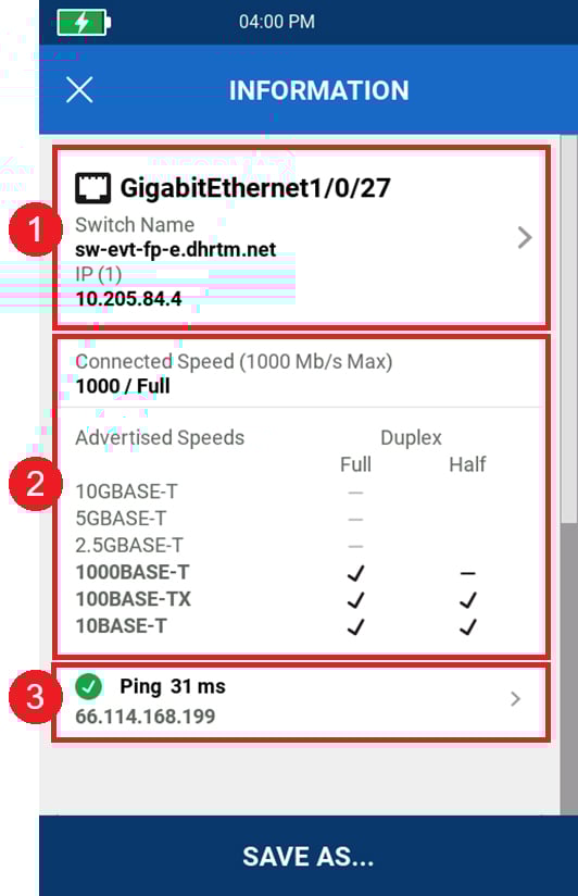 - Fiber optic network testing features including: IPv4 and v6 ping, nearest switch diagnostics (IP address, name, port / VLAN number)