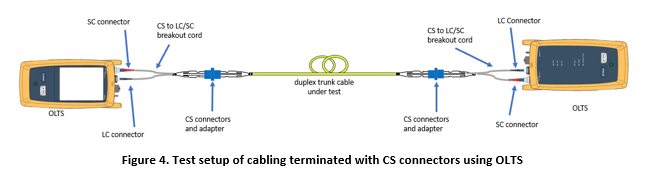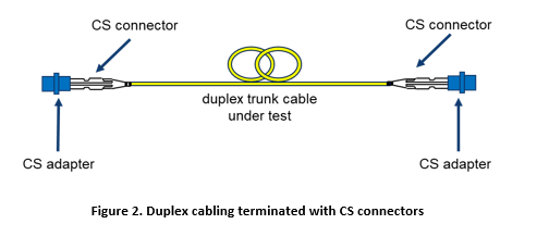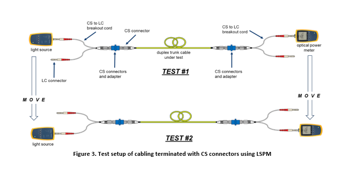 Using a light source and power meter, as shown in Figure 3, an attenuation measurement can be made. In this example, the light source and power meter have an LC interface. The cabling under test is terminated with CS connectors and adapters. A CS to LC breakout cord is needed on either side of the trunk cabling that is under test.