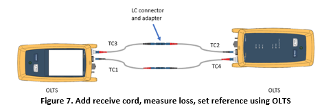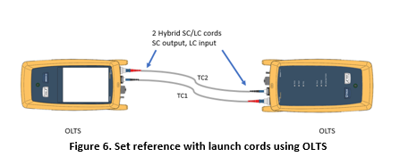 The first step is to set a reference with the launch cords (TC1 and TC2) using the 1-cord method (see Figure 6). The purpose of this first step is to prepare for the second step – to verify the condition of the test cord end face connections (launch and receive cords).