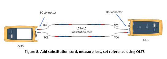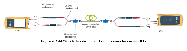 After the reference measurement is made, without disconnecting anything attached to the OLTS, remove the (duplex) substitution cord. In place of the substitution cord, add the CS to LC break-out cord and attach both ends of the CS ends of the break-out cord to the cabling under test as shown in Figure 9. The measured attenuation is the loss of the fiber in the cabling plus the loss of the two connectors in the cabling, minus the substitution cord loss of the two connectors.