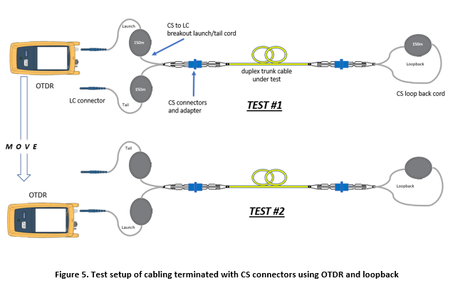 For the OTDR test method, the breakout cords (launch and tail cords) should be at least 150 meters for single-mode. The launch and tail cords create optical separation between the OTDR emitted pulses detected at the instrument and the connectors. In this way, an attenuation and return loss measurement can be made at the CS connectors. To reduce test time and to make a better measurement, a bidirectional test using a loopback cable can be done in two steps (see Figure 5.) The nice thing about the OTDR method is that a reference measurement is not needed.