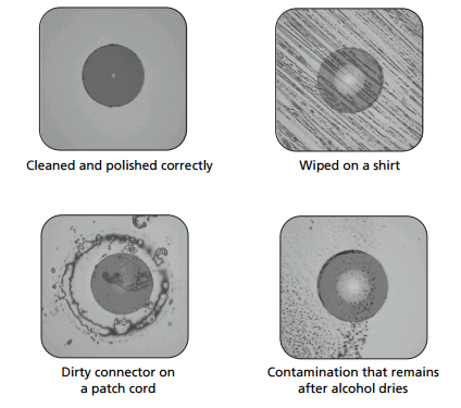 When a fiber link is not functioning properly, it is very likely caused by a dirty endface in a connector. Below are some examples of dirty endfaces and properly cleaned and polished endfaces. A “brand new in the bag” connector can be contaminated. To inspect is to know! If you already have a Fiber Inspector FI-1000 and fiber cleaning supplies with your CertiFiber Pro kit, you can save a lot of time and avoid frustration by taking the time to clean and inspect before you attempt to certify fiber links.