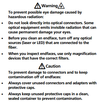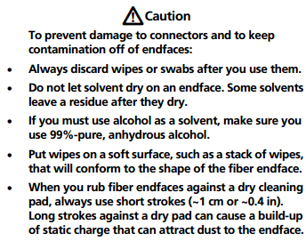 To prevent damage to the device and to connectors and to keep contamination off of endfaces, read all instructions and obey all safety precautions given in the instructions for the device you use to clean connectors.