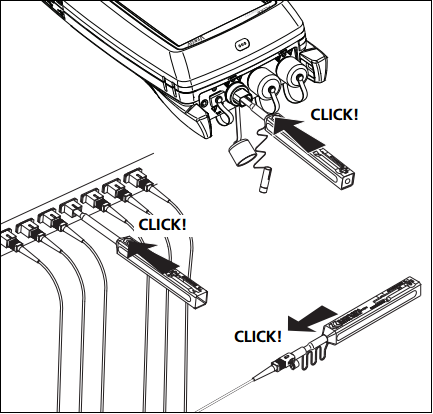 Always clean and inspect the endfaces in fiber optic connectors before making connections. Fluke Networks recommends using a mechanical device such as the Fluke Networks Quick Clean Cleaner to clean connectors on network equipment. If you do not have such a device, if the device cannot adequately clean the connector, or when cleaning connectors on test reference cords, use other fiber-grade supplies such as wipes and solvent.